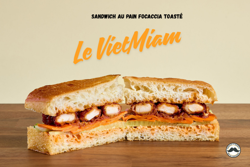 Les tenders de poulet sont encore meilleurs lorsqu’ils sont bien accompagnés. Notre VietMiam est un sandwich chaud avec un bon pain Focaccia. Dedans, nous mettons une mayonnaise au Sriracha, des légumes marinés (usuellement des carottes et du concombre) ainsi qu’une sauce Hoisin (à base de sésame). Afin de vous faire voyager encore davantage, nous pouvons y ajouter des graines germées. Effet WoW garanti !
