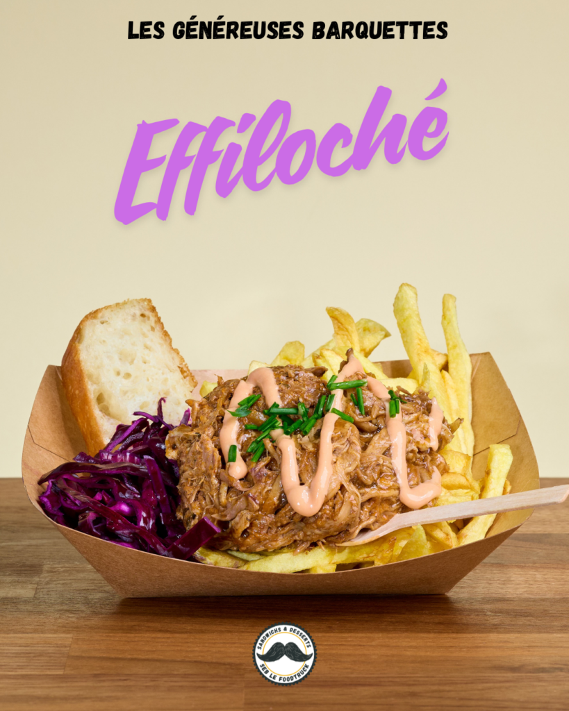 La très belle surprise de cet été 2025. Nous ne pensions pas qu’il serait à ce point apprécié notre effiloché de porc ! La généreuse barquette effiloché repose sur une belle portion de frites sur laquelle nous déposons notre pulled pork maison en compagnie de chou mariné, de pickles d’oignons rouge, d’un granola salé ainsi qu’une sauce au raifort et aux cornichons proche d’un certain big mac. Il nous arrive d’y ajouter de la ciboulette mais c’est surtout dans un soucis d’esthétisme.